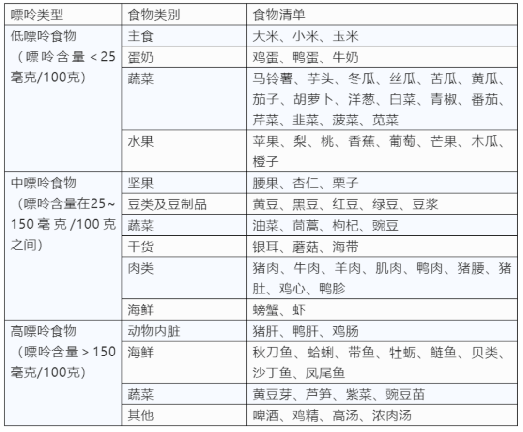 根据食物嘌呤含量不同,我们将食物分为:低嘌呤食物(每100克食物含嘌呤<25毫克);中等嘌呤食物(每100克食物含嘌呤25-150毫克);高嘌呤食物(每100克食物含嘌呤>150毫克)。