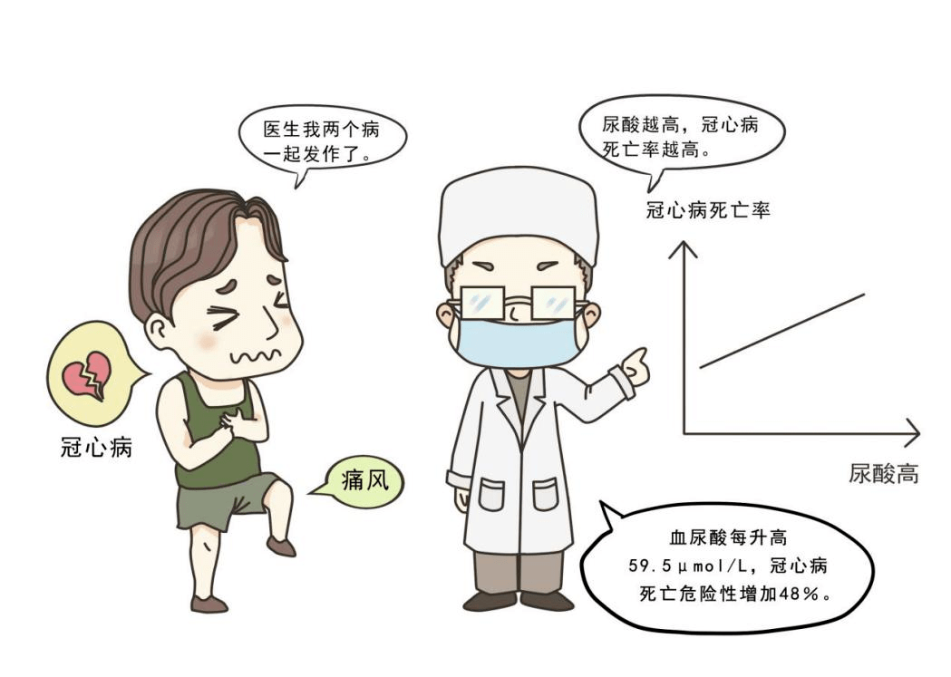 有些患者认为痛风只是引起手脚关节疼痛的小毛病,并没有重视及治疗。相关研究表明,尿酸水平与冠心病死亡风险成正相关,血尿酸每升高59.5μmol/L,死亡风险男性增加48%,女性增加126%,而且痛风发作会增加心血管疾病的发生风险。英国最新的一项分析了6.3万例痛风患者的研究表明,在痛风发作后的2个月内急性心梗或脑卒中的发生增加100%,3-4个月内增加57%。