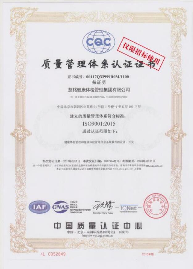 质量管理体系认证证书 发布时间:2018-03-08作者:洛阳慈铭健康管理有限公司点击:3947 次 上一篇:没有了 下一篇:室间质评证书 分享到:0 用手机看 拍下二维码,信息随身看 试试用微信扫一扫,在你手机上继续观看此页面。