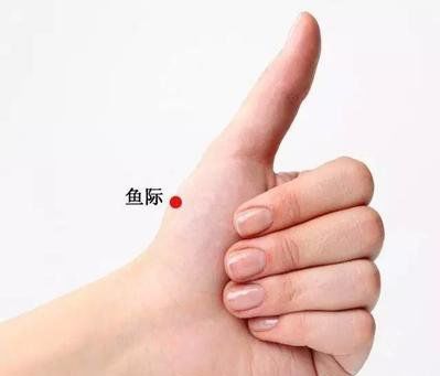 ①鱼际穴在手拇指本节(第1掌指关节)后凹陷处,约当第1掌骨中点桡侧,赤白肉际处。鱼际穴具有很好的定喘效果,主治咳嗽气喘、咳血、咽喉肿痛、发热等症,还可以治疗胃痉挛,因为肺经环循胃口。