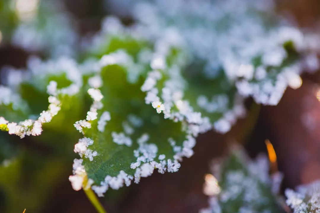 寒露时,露珠晶莹剔透,泛着亮光,而到了霜降,气温继续下降,于是圆润的露珠摇身一变,凝成六角形的霜花,形成入冬前的初霜景象。